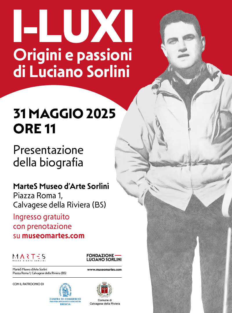 L’evento, dal titolo I-LUXI Origini e passioni di Luciano Sorlini, si terrà nei giardini del MarteS Museo d’Arte Sorlini di Calvagese della Riviera alla presenza dell’autore, Marcello Zane e Stefano Sorlini, Presidente della Fondazione Luciano Sorlini, insieme ad alcune testimonianze di amici, colleghi e collaboratori. Modera l’incontro il giornalista e studioso Massimo Tedeschi.